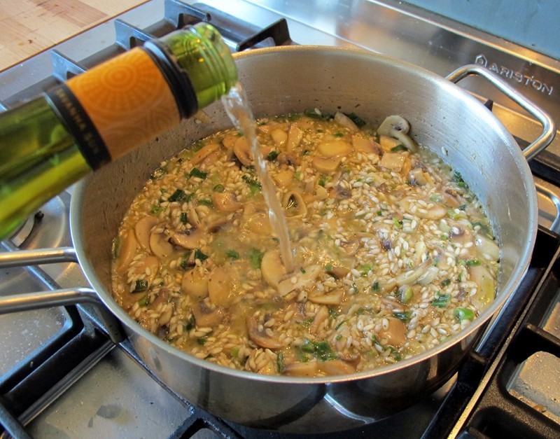 Risotto ris tilsættes og steger med i få minutter inden der tilsættes en lille del hvidvin.