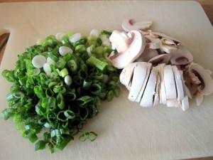 Forårsløg skæres fint og champignon deles i mindre stykker efter smag.