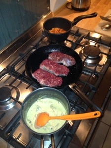 Dagens ret, bøffer af oksefilet med stegte gulerødder, hasselbach’er og champignon sauce. Simpelt hurtigt og lækkert.